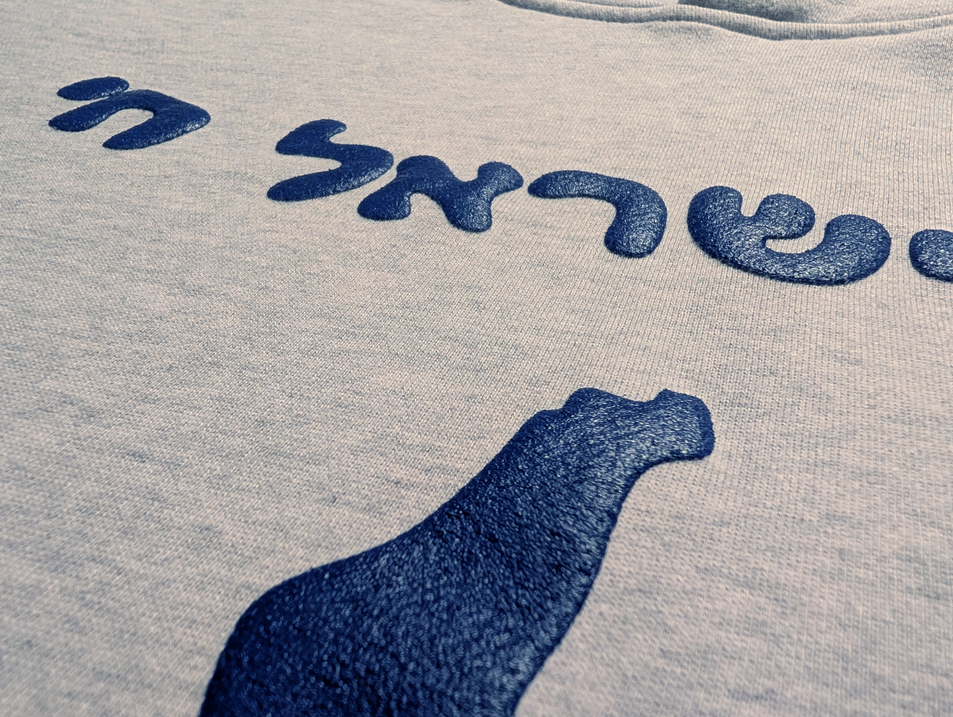 Hoodie with "Am Yisrael Chai" in Hebrew and the shape of Israel, printed in puff print.