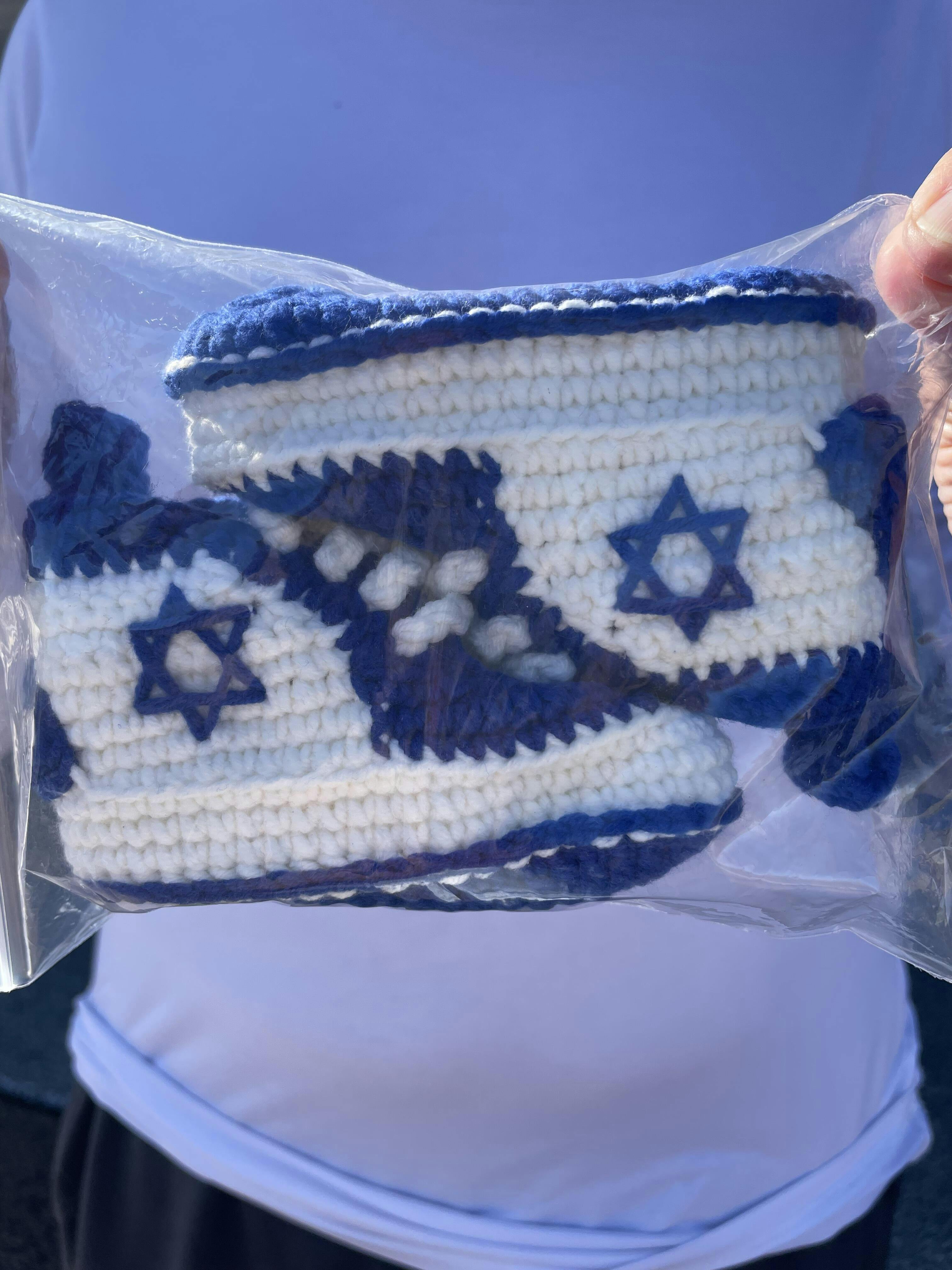 Hand-knit blue and white baby sneakers resembling the flag of Israel. Newborn (3.5") and 3-9 month (4.3") models available. For futher children's sizes, see the Blue/Gum model.