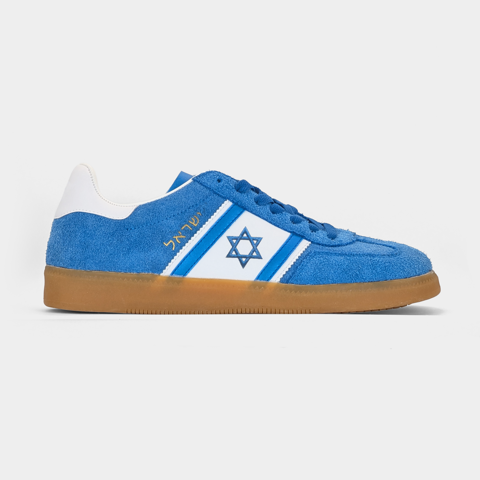 Blue and white low-top sneakers featuring the flag of Israel across the side. Gum sole. Children's sizes available.