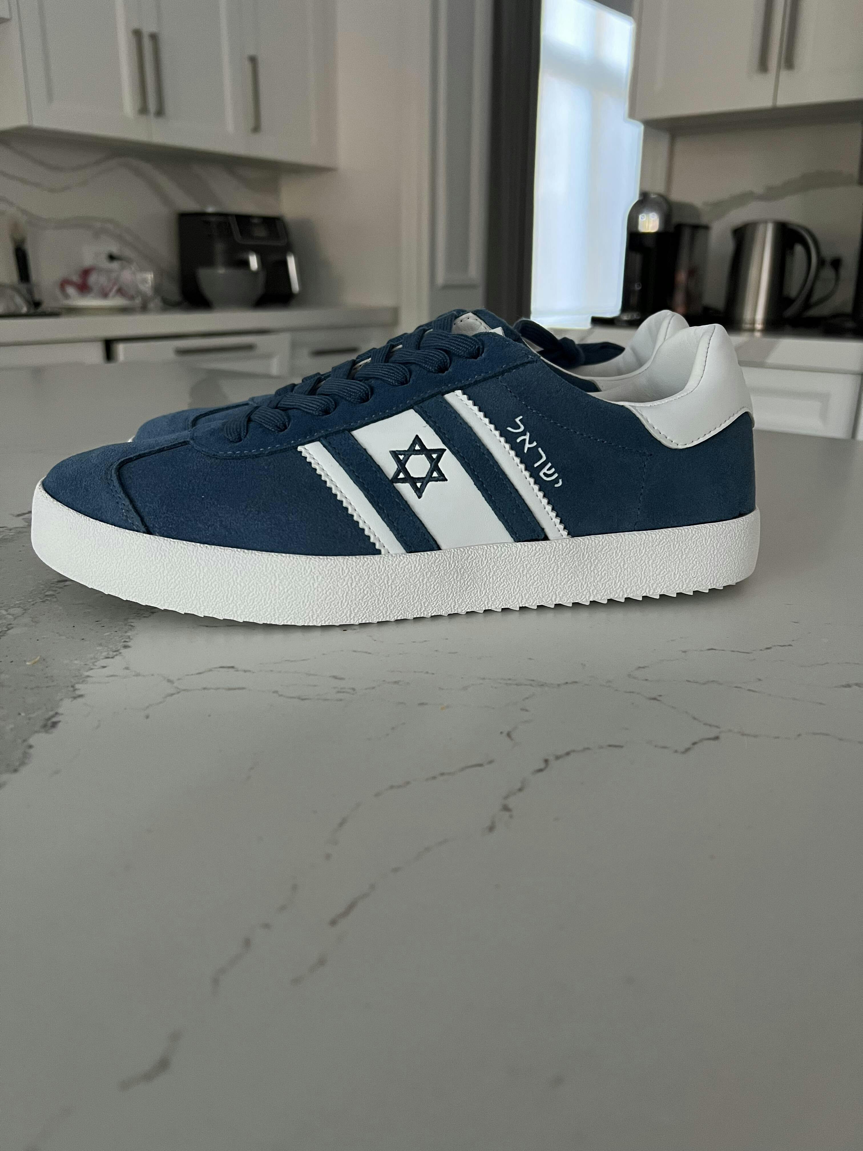 Blue and white low-top Israel sneakers featuring the Israeli flag across the side. Navy blue with white sole. For children's sizes, see the Blue/Gum model.